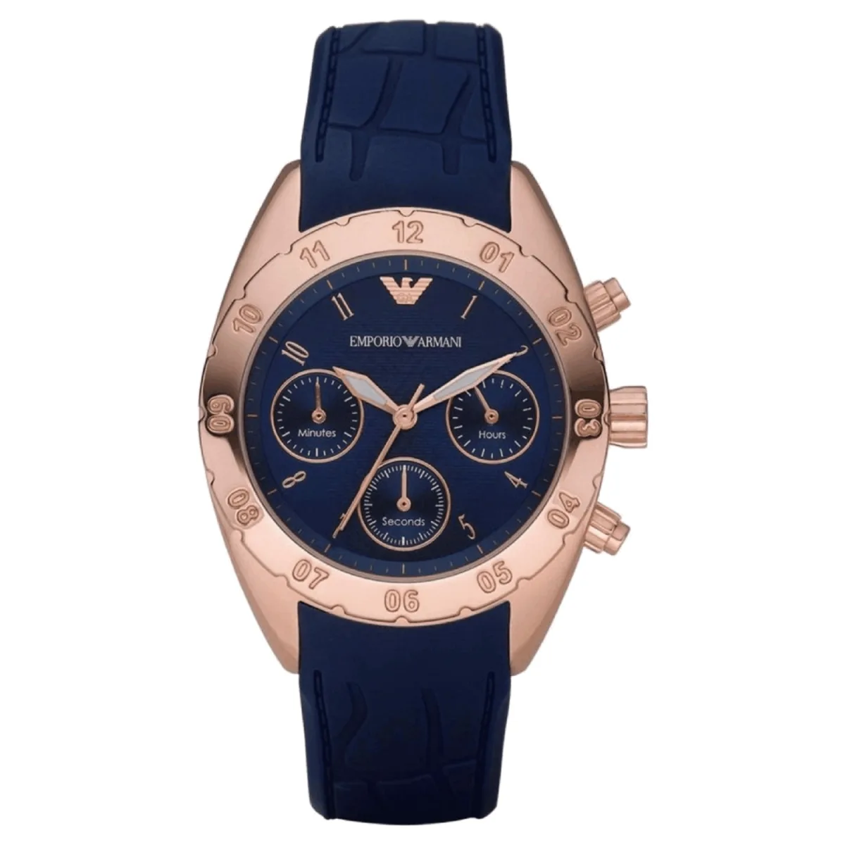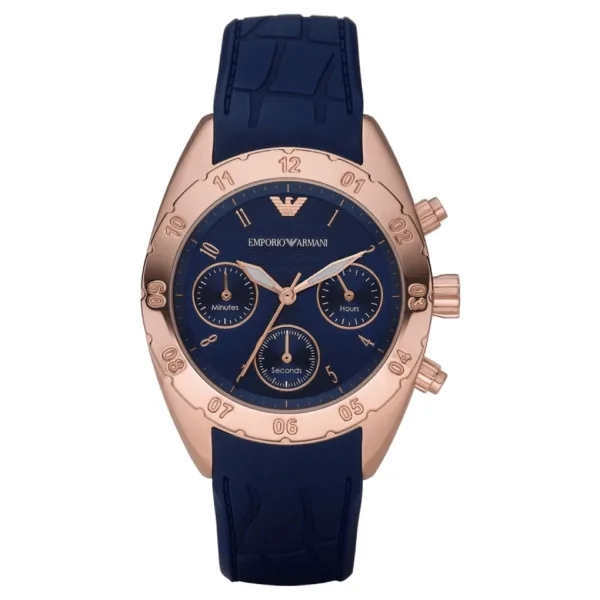 Emporio Armani Dameshorloge Kwarts Roosgoud• Materiaal kastdeksel: Roestvrij staal• Soort glas: Mineraal• Materiaal Band: Siliconen• Kleur kast: Roosgoud• Waterdichtheid: 30 m (3 ATM)• Diameter: 35 mm