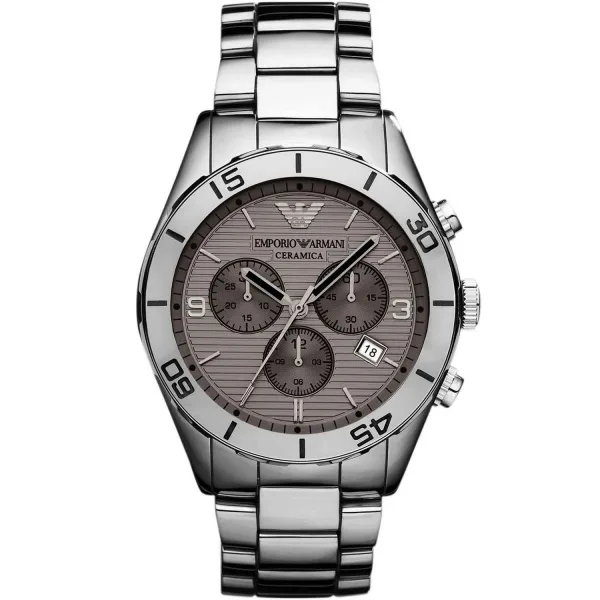 Emporio Armani Herenhorloge Kwarts Grijs• Materiaal kastdeksel: Keramiek• Soort glas: Mineraal• Materiaal Band: Roestvrij Staal• Kleur kast: Grijs• Waterdichtheid: 50 m (5 ATM)• Diameter: 43 mm