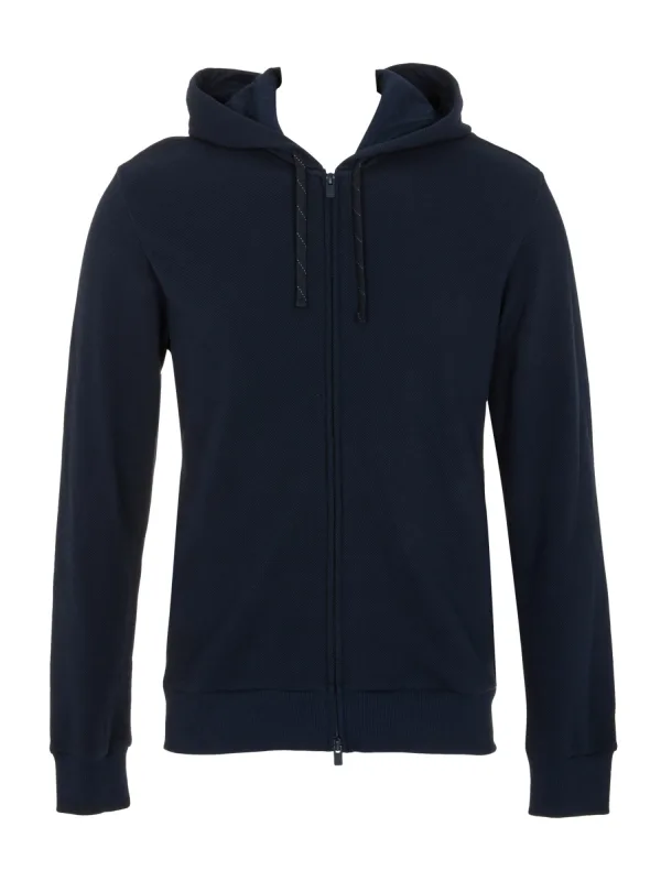 De combinatie van ontspannen comfort met verfijnde elegantie, dit Emporio Armani sweatvest met rits en capuchon voegt een stijlvolle maar comfortabele uitstraling toe aan elke outfit. De verstelbare capuchon zorgt voor een perfecte pasvorm, de zijzakken in kangoeroestijl bieden praktische opbergruimte, en de elastische zoom en boorden benadrukken de casual maar premium uitstraling van dit kledingstuk, perfect voor loungewear.