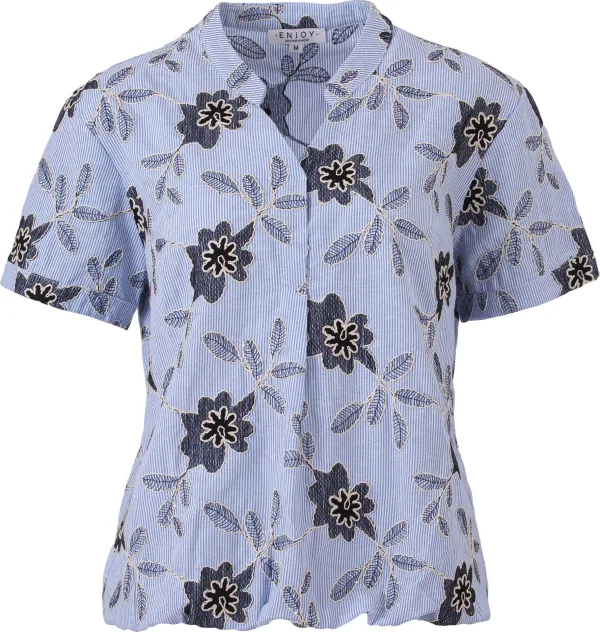 Top, top korte mouw van Enjoy met regular pasvorm, split hals en opstaande kraag, sluiting met knopen. Het blauwe streeppatroon is gecombineerd met bloemenprint, korte mouwen en een licht getailleerd silhouet, ideaal voor een casual outfit met een nette uitstraling.