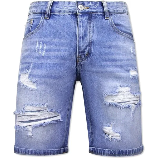 Exclusieve korte broek voor heren met div. specificaties. Deze blauwe korte broek heeft een uitstekende afwerking en een Slim-Fit pasvorm. - Specificaties:- KKorte Broek Heren met Gaten- Denim Short - Artikelcode: RJ-951- Kleur: Zie afbeelding- Seizoen: Zomer- Pasvorm: Slim Fit- Sluiting: Knopen- Patroon: Ribbed- Materiaal: 100% Katoen, geen stretch- Weefsel: Denimweefsel - Zakken: 2 Voorzakken en 2 Achterzakken- Wasvoorschrift: Machinewas 30 graden (Niet in de droger)- Beschikbare maten: 28 - 30 - 32 - 34 - 36 - 38