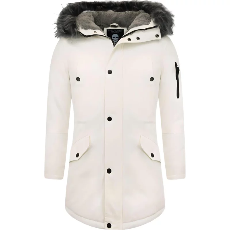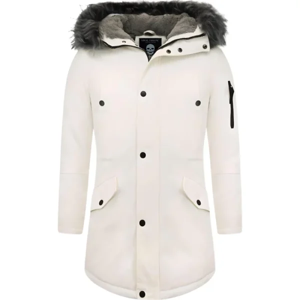 Dit is een parka winterjas met bontkraag in het wit. Een lekkere warme goed gevoerde lange jas, die veel comfort bied tijdens de winter. - Productinformatie: Heren parka jas Heeft een zwarte faux bontkraag Heeft een elegante wit kleur Comfortabel en warm model, perfect voor de winter Lang model met een slim fit pasvorm Het materiaal bestaat uit katoen PU De voering bestaat uit 65% katoen 35% polyester Heeft een rits met knopen als sluiting Het model heeft 4 jaszakken en 1 binnenzakken De capuchon is niet afritsbaar De fuax bontkraag is wel afritsbaar Breng hem naar de stomerij voor een maximale levensduur Verkrijgbaar in de maten S – M – L – XL