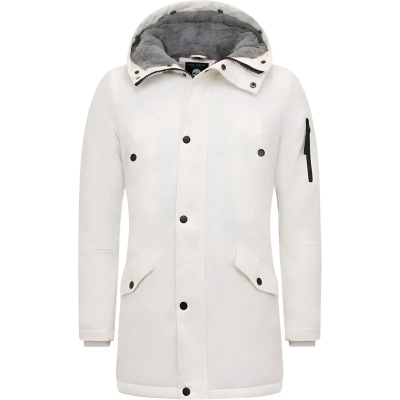 Witte Winterjas Heren Parka - Productinformatie: Witte Winterjas Heren Parka Comfortabel en warm model, perfect voor de winter Lang model met een slim fit pasvorm Het materiaal bestaat uit katoen PU De voering bestaat uit 65% katoen 35% polyester Heeft een rits met knopen als sluiting Het model heeft 4 jaszakken en 1 binnenzakken De capuchon is niet afritsbaar Voorgedrukte knopen / rits aan capuchon.Zelf uit te breiden met nep bontkraag (wordt meegeleverd) Breng hem naar de stomerij voor een maximale levensduur Verkrijgbaar in de maten S – M – L – XL