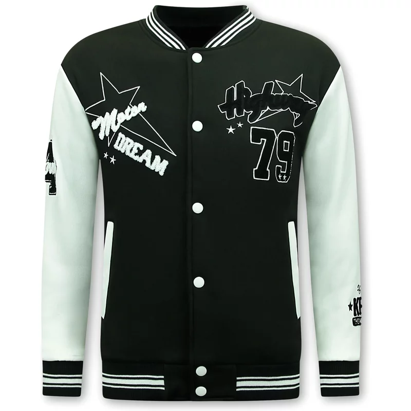Varsity Vest Heren - Baseball Jas - 903 - Zwart - Specificaties:- Varsity Vest Heren - Baseball Jas- Pasvorm: Oversized- Patroon: Print, Applicaties- Sluiting: Drukknopen- Voering: 100% Polyester- Zakken: 2 Jaszakken- Seizoen: Voorjaar / Najaar (Dunne uitvoering)- Weefsel: Dun Geweven - Wasvoorschrift: Handwas, Binnenste buiten wassen (Niet in de droger)- Beschikbare maten: XS - S - M - L - XL