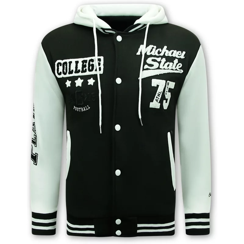 Varsity vest met Capuchon - 905 - Zwart - Specificaties:- Varsity vest met Capuchon- Pasvorm: Oversized- Patroon: Print, Applicaties- Sluiting: Drukknopen- Voering: 100% Polyester- Zakken: 2 Jaszakken- Seizoen: Voorjaar / Najaar (Dunne uitvoering)- Weefsel: Dun Geweven - Wasvoorschrift: Handwas, Binnenste buiten wassen (Niet in de droger)- Beschikbare maten: XS - S - M - L - XL