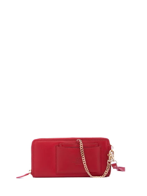 Damesportemonnee met ritssluiting. één met ritssluiting, kaarthouder en binnenzakken met bankbiljethouder. één open externe achterzak. ontbrekende schouderband. ketting handvat. Drie binnenvakken. extern materiaal. gevoerd met polyester binnenkant. Afmetingen: 20x10x2 cm. Modeproduct
