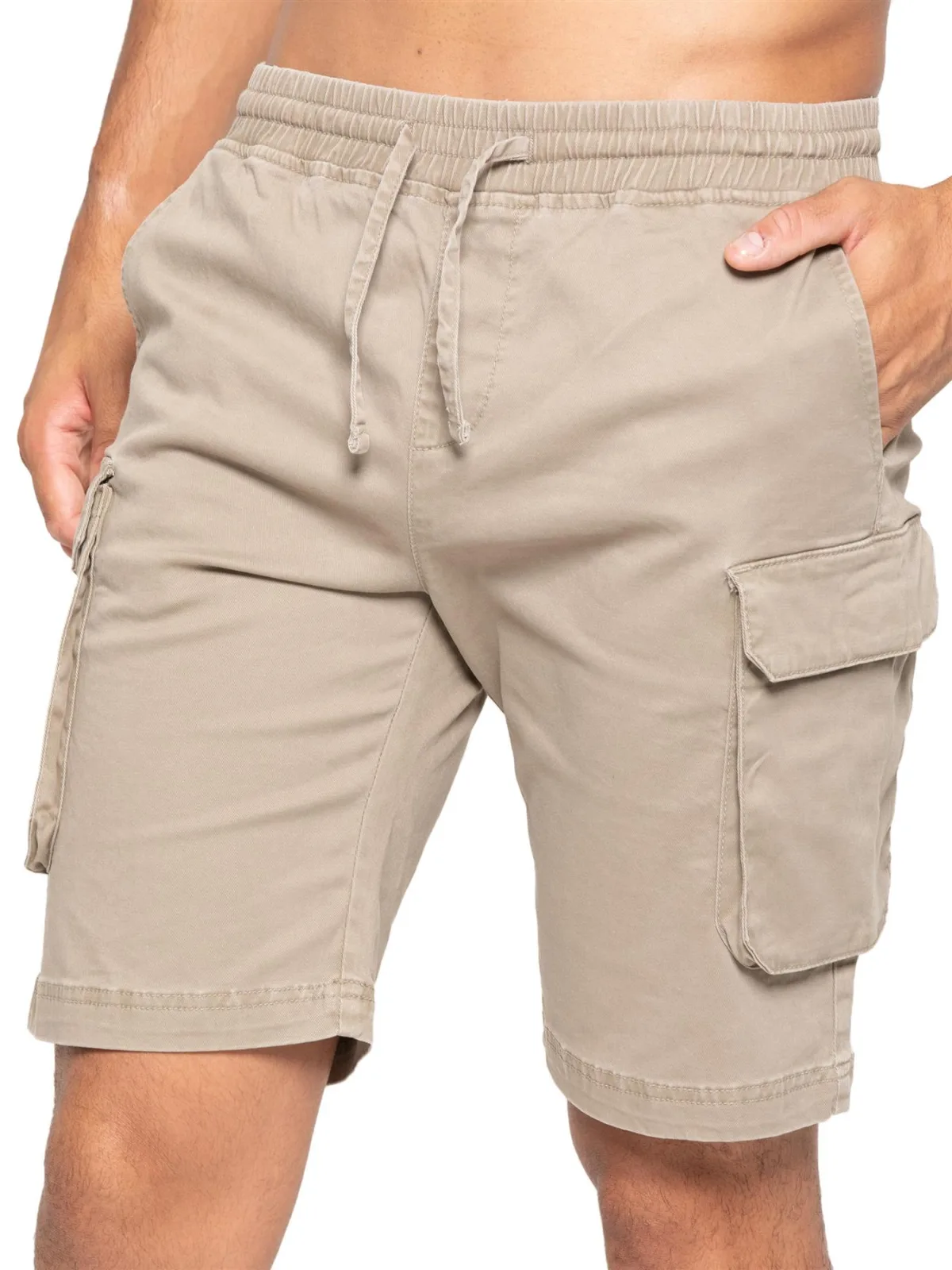 Enzo Heren Cargo Stretch Shorts. Elastische tailleband met verstelbaar trekkoord. Ontwerp met 5 zakken. 2 Zijzakken, 2 Cargo zakken met klittenbandsluiting. Enkele achterzak. Halfhoog, normale pasvorm.