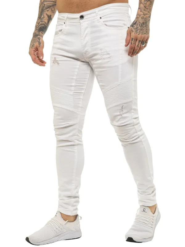 Enzo Heren Skinny Stretch Biker Denim Jeans Wit