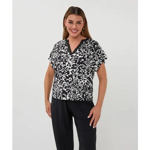 Voeg een stijlvolle basis toe aan je garderobe met deze Esqualo dames top met bloemenprint. De zwart / ecru print geeft direct een rustige, vrouwelijke uitstraling, terwijl de kapmouwen en V-hals zorgen voor een moderne, verfijnde look. Deze top komt uit de Boutique collectie en is ideaal voor lentedagen waarop je er verzorgd uit wilt zien zonder veel moeite.Details die je elke dag kunt dragen Zwart / ecru bloemenprint voor een tijdloze, elegante uitstraling V-hals die mooi langs de hals valt en makkelijk te combineren is met sieraden Kort model met kapmouwen, fijn voor het voorjaar en zomerse dagen Gemaakt van 95% viscose / 5% spandex voor een soepele stof met lichte stretch Geen zakken voor een rustig en clean silhouet Onderdeel van de Boutique collectie, met aandacht voor mooie detailsGemakkelijk combineren van werk tot weekendDeze top past net zo goed bij een nette broek voor op kantoor als bij een jeans in het weekend. De zwart / ecru kleuren sluiten mooi aan op basics in je kast, waardoor je snel een complete outfit samenstelt. Door de lichte stretch beweegt de stof prettig met je mee tijdens je dag.Esqualo: verfijnde damesmodeEsqualo staat bekend om vrouwelijke items met doordachte prints en een draagbare pasvorm. De collecties volgen de trends per seizoen, maar blijven goed te combineren met de favorieten die al in je kast hangen. Zo bouw je stap voor stap aan een garderobe vol fijne, betrouwbare stijlen.Een veelzijdige top die je seizoen na seizoen uit de kast blijft pakken.