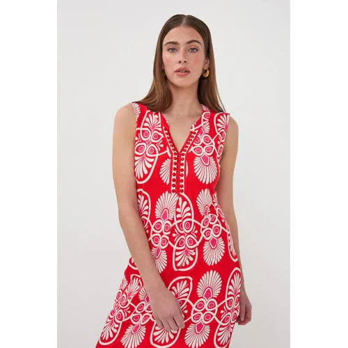 Deze grafische midi jurk van Esqualo geeft je garderobe in één keer een andere uitstraling. De combinatie van rood en ecru valt op zonder overheersend te zijn en de middellange lengte maakt de jurk geschikt voor verschillende gelegenheden. De soepele stof met 95% viscose en 5% elastaan volgt je bewegingen gemakkelijk en de V-hals en mouwloze snit zorgen voor een open, luchtige look in het voorjaar.Kenmerken van deze grafische midi jurk Midi lengte, valt rond de knie voor een rustige en toegankelijke look Mouwloos model, geschikt voor warmere dagen of met een vestje erover V-hals die het decolleté op een subtiele manier omlijst Zachte, soepele stof van 95% viscose en 5% elastaan Grafische print in rood en ecru Zonder sluiting, je trekt de jurk eenvoudig aan over het hoofd Geen zakken voor een glad silhouet zonder extra volumeGeschikt voor verschillende momentenDeze jurk leent zich goed voor een werkdag, een lunch op het terras of een dagje weg. Combineer met sandalen of sneakers voor een ontspannen look of met een blazer en hakken voor een meer geklede stijl. Dankzij de middellange lengte blijft de jurk praktisch, ook als je veel beweegt op een dag.Esqualo, eigentijdse mode met kleur en printEsqualo richt zich op eigentijdse damesmode met aandacht voor kleur, prints en draagbaarheid. De collecties worden ontworpen met oog voor detail en pasvorm, zodat je items in je kast hebt waar je makkelijk naar teruggrijpt.Een jurk die je eenvoudig combineert en waar je een groot deel van het seizoen plezier van hebt.
