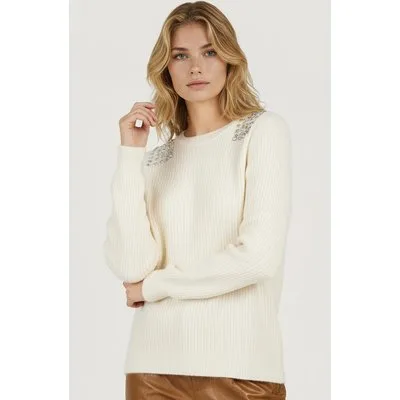 EsQualo Sweater Shoulder Pearls Off White