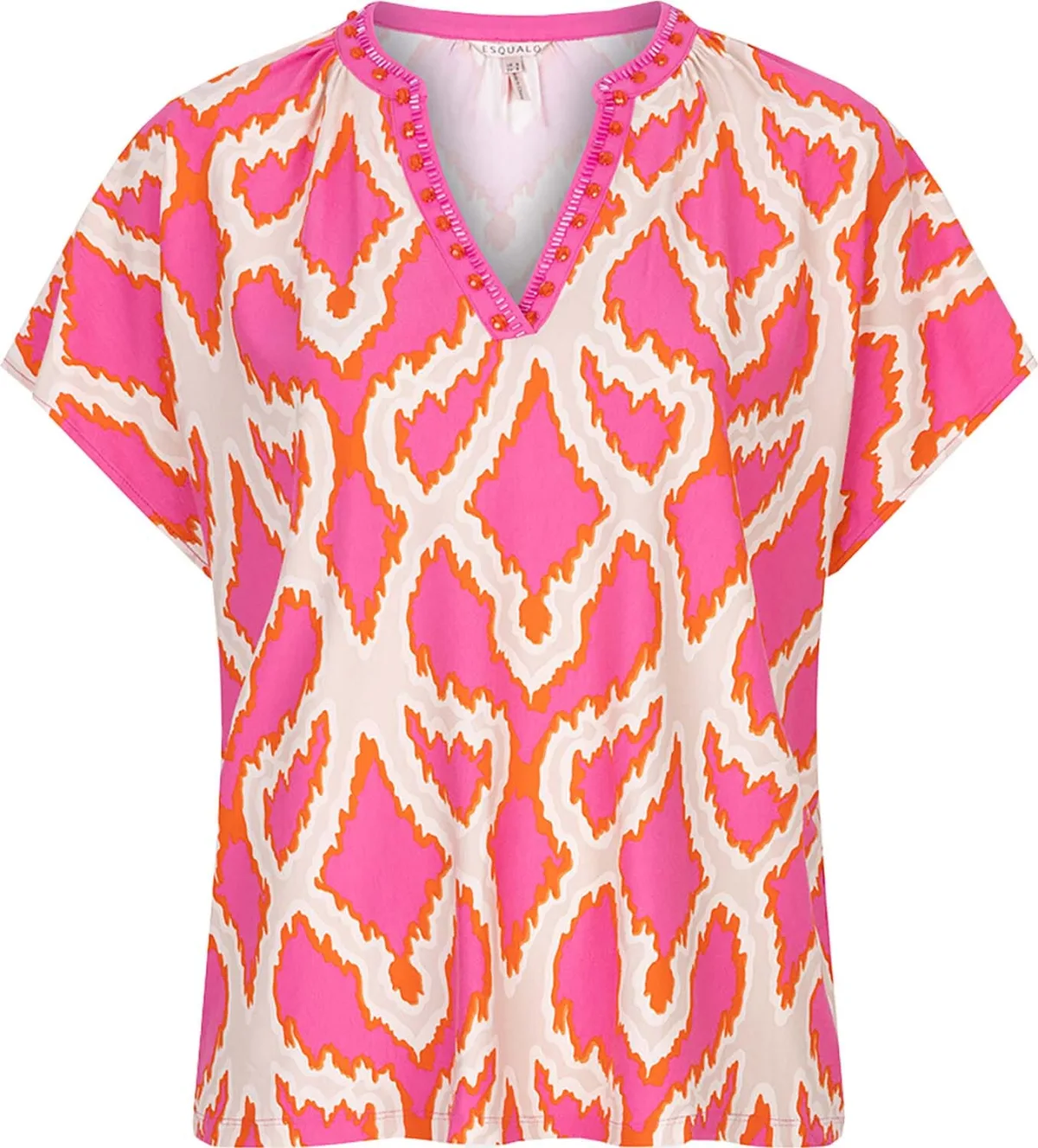 De Top beads Disco Spark van Esqualo is een korte mouw top met een levendig patroon in roze en oranje tinten. De halslijn is versierd met glinsterende kralen, wat een speels en modieus accent toevoegt. Ideaal voor een vrolijke en stijlvolle look.