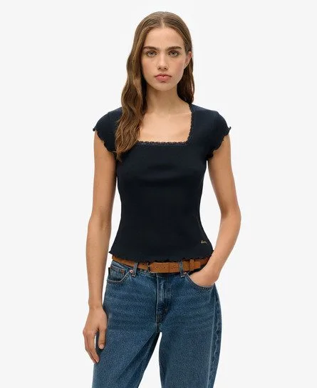 Slimfit - de nauwsluitende pasvorm zorgt voor een meer geklede look Vierkante halslijn met kanten rand, gerimpelde armsgaten en zoomlijn Geribbeld materiaal en een geborduurde kenmerkende tekst op de zoom Het Essential T-shirt met vierkante hals en korte mouwen is een prachtig ingetogen T-shirt dat we vakkundig hebben gemaakt met een vrouwelijke kanten halslijn en een slanke pasvorm. Dit perfecte veelzijdige T-shirt kun je het in koudere seizoenen dragen of stijlvol met een paar van onze denim s