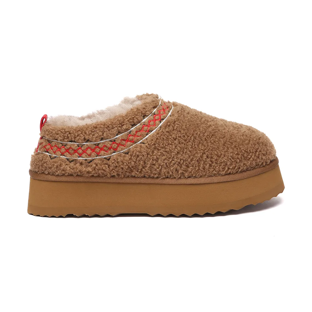 Deze pantoffels zijn ontworpen voor ultiem comfort. De buitenkant van pluizige imitatie-shearling en de voering van schapenvachtwol houden je voeten warm, terwijl de 4 cm EVA-platformzool lichtgewicht grip en demping biedt. Perfect voor binnen of lichte buitenactiviteiten.Productdetails: Bovenwerk: Imitatie shearling Voering: Schapenvachtwol Binnenzool: Schapenvachtwol Zool: EVA Platformhoogte: ca. 4 cm