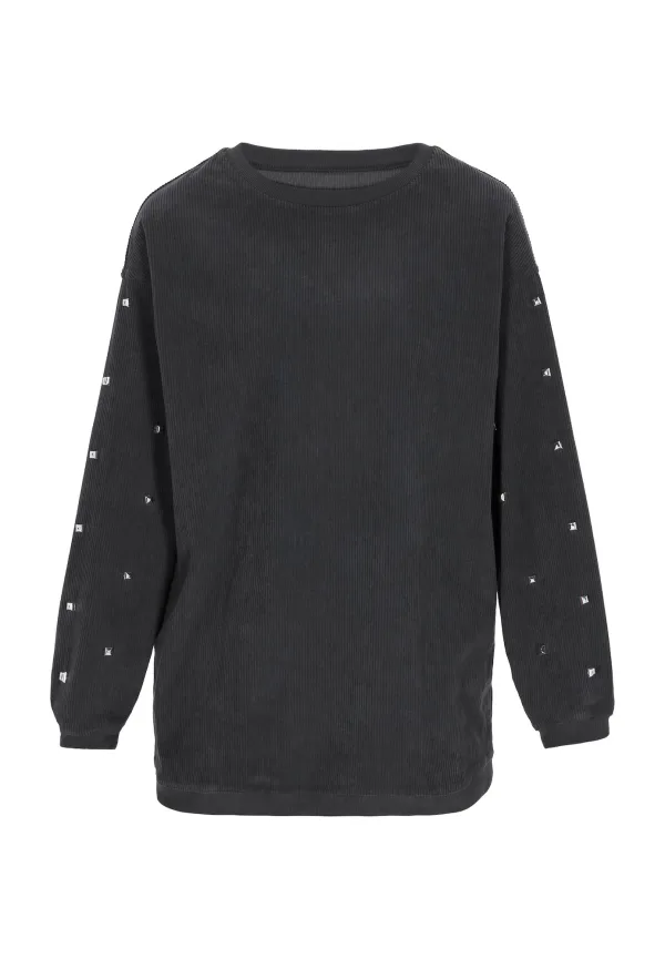 Design: Overcut schouder; Materiaal: Sweatstof; Halstype: Ronde hals; Motief: Effen; Details: Sierstenen; Extra's: Studs, Met textuur; Pasvorm: Normale pasvorm; Armlengte: Lange mouw; Lengte: Normale lengte