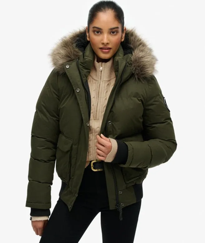 Relaxed pasvorm - de klassieke Superdry pasvorm. Niet te smal, niet te ruim, precies goed. Kies je normale maat Capuchon met koordjes en aparte binnenkraag Afneembare kunstbontrand Rits- en drukknopsluiting Eén binnenzak en vier voorzakken Geribbelde manchetten en zoom Volledig gevoerd Geborduurd embleem op de linkermouw Het klassieke bomberjack is een betrouwbare basis voor winterse warmte, met een onderscheidende stijl dankzij de kenmerkende kunstbontrand en luxueus comfort. De microvezel is n