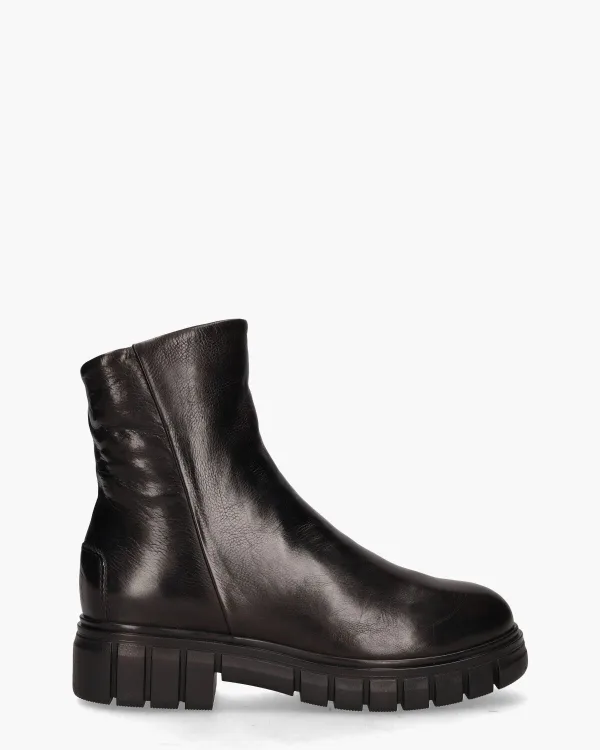 Enkelboots voor dames 77645 uit de collectie van Everybody. Deze laarzen hebben een bovenzijde van zacht en soepel zwart leer. De binnenkant is in veloursstof met een vast voetbed uitgevoerd. De schacht is ongeveer 14 cm hoog en loopt iets schuin af. Opvallend zijn de zwarte grove rubberen 2 cm zool en hak van 4,5 cm hoog. De boots
