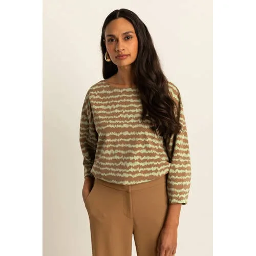 Deze bruine dames top met all over print van Expresso geeft je outfit meteen een verfijnde uitstraling. De top heeft een bruine/groene print die subtiel opvalt en mooi combineert met zowel lichte als donkere onderstukken. De boothals legt het accent elegant bij je halslijn en de driekwart mouwen zorgen voor een luchtige, maar aangeklede look, ideaal voor het voorjaar.Details die het verschil maken Gemaakt van 80% polyamide en 20% elastaan voor een soepele, aansluitende pasvorm All over print in bruin/groene tinten voor een stijlvolle, moderne uitstraling Boothals die mooi langs je hals en schouders valt Driekwart mouwen met rechte mouwinzet voor een rustige belijning Valt in de Boutique collectie, voor een wat meer uitgesproken modegevoel Geschikt voor het lenteseizoen en uitgevoerd in standaardmatenVeelzijdig te combineren in je dagelijkse looksDeze top past makkelijk in je garderobe. Combineer met een donkere broek voor een nette werkdag of draag de top op een lichte jeans voor een meer casual uitstraling. Het soepele materiaal beweegt prettig mee, waardoor de top comfortabel zit tijdens een drukke dag.Expresso: modieuze stijl met aandacht voor detailExpresso staat bekend om mode die is ontworpen met aandacht voor pasvorm en vrouwelijke lijnen. De collecties sluiten aan op de nieuwste trends, maar blijven tegelijkertijd draagbaar in het dagelijks leven. Met deze top kies je voor een doordacht ontwerp dat stijl en comfort combineert op een betrouwbare manier.Een sfeervolle basic met print die je het hele seizoen graag uit de kast pakt.