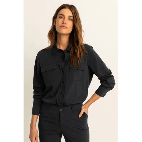 Deze damesblouse van Expresso heeft een aansluitende pasvorm en lange mouwen. De blouse is gemaakt van travelstof en heeft een klassieke kraag. De knoopsluiting en borstzakken maken het geheel af.