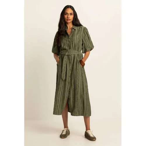 Til je voorjaarsgarderobe naar een hoger niveau met deze olijfgroene jurk van Expresso. De geweven blousejurk valt op midi-lengte en sluit licht aan op je silhouet, terwijl de ceintuur in de taille voor extra vorm zorgt. De effen olijfgroene kleur geeft een rustige uitstraling die zowel overdag als in de avond goed tot zijn recht komt.Olijfgroene midi-jurk met doordachte details Midi-lange blousejurk, geschikt voor zowel werk als vrije tijd Effen olijfgroene kleur voor een rustige, verzorgde look Klassieke kraag en volledige knoopsluiting aan de voorkant Korte pofmouwen voor een eigentijdse uitstraling Geweven, soepelvallende stof die glad langs het lichaam valt Ceintuur in de taille voor een duidelijk geaccentueerde taille Zonder zakken voor een strakke, gestroomlijnde vorm Geschikt voor het lenteseizoen en ook fijn te dragen met laagjesVan meeting tot dinerDeze jurk leent zich goed voor dagen waarop je agenda vol staat. Combineer voor een zakelijke dag met nette loafers of enkellaarsjes. Voor een etentje wissel je eenvoudig naar sandalen met hak en een subtiele ketting. Door de knoopsluiting kun je de halslijn precies zo open of gesloten dragen als jij prettig vindt.Expresso, stijl met aandachtExpresso staat bekend om doordachte damesmode met een pasvorm die is afgestemd op het vrouwelijk silhouet. De collecties zijn ontworpen met aandacht voor detail en draagcomfort, zodat je de kleding vaak en lang kunt dragen. Met deze jurk haal je een vaste basis in je kledingkast waar je seizoen na seizoen op kunt terugvallen.Een veelzijdige basisjurk waarmee je eenvoudig een verzorgde look samenstelt.