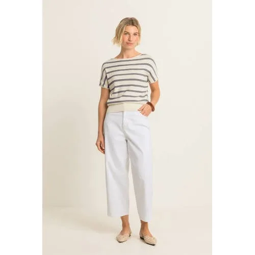Voor een frisse, moderne uitstraling in je garderobe is deze katoenen trui voor dames van Expresso een praktische basis. De trui heeft een korte lengte en korte mouwen, passend bij het lenteseizoen. De ecru met zwarte strepen zorgen voor een rustig streeppatroon dat duidelijk aanwezig is in je outfit. De boothals zorgt voor een open halslijn en laat net genoeg schouderpartij zien.Details die het verschil maken Gemaakt van 100% katoen, voelt zacht en ademend aan op de huid Ecru / zwarte streepprint voor een duidelijk grafisch effect Korte lengte, goed te combineren met een hoge taille broek of rok Korte, rechte mouwen voor een lichte uitstraling Boothals die subtiel het sleutelbeen accentueert Gebreide uitvoering uit de Boutique collectie voor een verzorgde afwerkingMooi in alledaagse combinatiesDeze trui laat zich makkelijk stylen. Draag hem boven een zwarte pantalon voor een geklede combinatie in rustige kleuren of kies voor een lichte jeans voor een meer casual combinatie. Door de korte lengte komt een hoge taille duidelijk naar voren en blijft je outfit in balans.Expresso: stijl met aandacht voor detailExpresso staat bekend om mode die is ontworpen met oog voor pasvorm en uitgewerkte details. De collecties sluiten aan op het dagelijks leven en zijn herkenbaar door de doordachte lijnen, kleuren en prints. Met deze trui haal je een item in huis dat constante kwaliteit biedt en qua ontwerp aansluit op het huidige modebeeld.Een knit die het hele seizoen door passend is bij uiteenlopende combinaties.