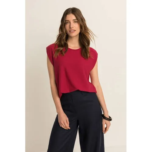 Deze effen rode dames top van Expresso is een stijlvolle basic voor het voorjaar. De top heeft een ronde hals en elegante kapmouwen die subtiel over de schouders vallen. De Boutique-collectie staat voor nette, doordachte ontwerpen en dat zie je terug in de rustige belijning en verzorgde afwerking. Gemaakt van 88% viscose voelt de stof soepel en zacht aan op de huid, waardoor deze top prettig draagt op warme dagen of onder een blazer.Rode top met kapmouwen voor elke dag Effen rode kleur voor een rustige, maar opvallende look Korte kapmouwen die de schouders mooi laten uitkomen Ronde hals die netjes langs de halslijn valt Gemaakt van 88% viscose voor een soepele, zachte touch Glad ontwerp zonder zakken voor een clean silhouet Onderdeel van de Boutique-collectie, ideaal voor nette en semi-casual outfitsVan kantoor tot dinerDeze top is geschikt voor verschillende momenten op een dag. Combineer met een nette pantalon en hakken voor een werkdag, of draag de top met een jeans en sneakers voor een ontspannen look. De effen rode kleur laat zich makkelijk combineren met zwart, wit of denim.Expresso met oog voor pasvormExpresso staat bekend om vrouwelijke mode met aandacht voor vorm en detail. De collectie is ontworpen om je garderobe overzichtelijk en draagbaar te maken, met items die goed te combineren zijn en lang mooi blijven. Met deze top haal je een doordacht, stijlvol basisstuk in huis waar je vaak naar grijpt.Een comfortabele, nette top die je garderobe direct een frisse rode update geeft.