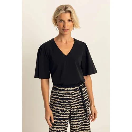 Deze zwarte dames top met driekwart mouw van Expresso is een veelzijdig basisstuk voor je garderobe. De effen zwarte kleur, de V-hals en de rechte mouwen zorgen voor een rustige, verzorgde uitstraling. Door het aansluitende stretchmateriaal valt de top mooi om het lichaam en voelt de stof soepel aan, ideaal voor zowel werk als vrije tijd.Details die het verschil maken Effen zwarte top, makkelijk te combineren met prints en basic items Driekwart mouwen, praktisch in het tussenseizoen en prettig bij binnen dragen V-hals die het halsgebied subtiel accentueert Gemaakt van een materiaal met 80% polyamide en 20% elastaan voor een soepele stretch Rechte mouwen en geen zakken voor een clean, gestroomlijnd silhouet Onderdeel van de Boutique collectie, met een verzorgde, vrouwelijke stijlGemakkelijk te stylen in elke lookDe top is geschikt voor veel momenten op de dag. Combineer met een nette pantalon en loafers voor een werkdag of draag hem met een jeans en sneakers voor een casual look. In de lente kun je de top solo dragen, op koelere dagen past hij goed onder een blazer of vest doordat het materiaal glad en niet te dik is.Expresso: oog voor pasvorm en detailExpresso is een Nederlands modemerk dat bekendstaat om vrouwelijke collecties met aandacht voor pasvorm en detail. De ontwerpen zijn afgestemd op het dagelijks leven, met stukken die je makkelijk combineert en lang draagt. Met deze top kies je voor een stijlvol basisitem dat past binnen die duidelijke, doordachte visie op mode.Een tijdloze zwarte top waar je het hele seizoen op kunt rekenen.