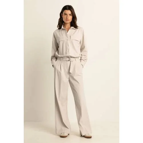 Deze Expresso wide leg damespantalon in crème is een veelzijdige basis voor je garderobe. Het wijde model valt soepel langs het been, terwijl de hoge taille voor een langere lijn zorgt. De gebreide kwaliteit met stretch sluit prettig aan in de taille en heupen en volgt je beweging gedurende de dag.Wijde pantalon met hoge taille in crème Wide leg pasvorm voor een recht en zwierig silhouet Hoge taille die aansluit rond middel en heupen Gemaakt van tachtig procent polyamide en twintig procent elastaan voor een soepele, rekbare stof Effen crème kleur die rustig oogt en makkelijk combineert Rits met haak- en knoopsluiting aan de voorkant Inclusief ceintuur in dezelfde stijl voor een afgewerkte look Zakken voor en achter voor een nette, pantalonachtige uitstraling Lange pijpen die soepel over de schoenen vallenVoor werk, events en alledaagse momentenDeze lange wide leg pantalon is geschikt voor situaties waar je verzorgd voor de dag wilt komen. De crème kleur en het rustige ontwerp maken het passend voor kantoor, een afspraak of een etentje. De gebreide stretchstof zorgt ervoor dat je je makkelijk kunt bewegen, ook als je de broek de hele dag draagt.Expresso: stijl met aandacht voor pasvormExpresso staat bekend om collecties waarbij pasvorm en draagbaarheid centraal staan. De modellen worden ontworpen met oog voor vrouwelijke lijnen en met materialen die prettig aanvoelen. Zo krijg je kleding die er netjes uitziet en die je gemakkelijk uit de kast pakt.Een moderne, wijde pantalon in een rustige crème tint die moeiteloos aansluit bij een verzorgde dagelijkse stijl.