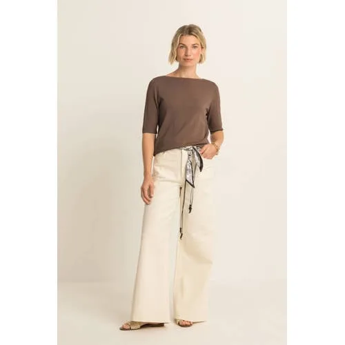 Deze bruine gebreide trui voor dames van Expresso is een praktische basic voor dagen waarop je er verzorgd uit wilt zien zonder veel moeite te doen. De trui heeft een korte lengte en een elegante boothals, waardoor je hals vrij blijft. De soepele brei van 63% viscose en 37% polyamide voelt zacht aan en valt prettig om je lichaam. De effen bruine kleur laat zich gemakkelijk combineren met je favoriete broeken en rokken.Comfortabele pasvorm met rustige details Korte trui, ideaal op een hoge taille jeans, pantalon of rok Boothals geeft een open, flatterende uitstraling Lange rechte mouwen voor extra draagcomfort Effen bruine kleur voor een rustige look Gemaakt van 63% viscose en 37% polyamide, voelt zacht en soepel aan Gebreide structuur zonder opvallende details voor een rustige basis Geen sluiting en geen zakken, zodat het silhouet strak blijft Geschikt voor het lente seizoen, maar ook fijn om in laagjes te dragenGemakkelijk te stylen in het dagelijks levenVoor een casual dag combineer je deze trui met een hoge jeans en sneakers. Wil je een meer geklede look, dan past de korte lengte goed bij een hoge pantalon en loafers of enkellaarsjes. De rustige effen kleur maakt het eenvoudig om sieraden of een sjaal toe te voegen.Expresso: stijlvolle mode met aandacht voor detailExpresso is een Nederlands modemerk dat bekendstaat om kleding met een doordachte pasvorm en verzorgde afwerking. De collecties sluiten aan op de dagelijkse garderobe, met items die je makkelijk combineert en vaak draagt. Deze trui past in die visie, met een comfortabele snit en rustige stijl.Een veelzijdig item dat je het hele seizoen door pakt voor een comfortabele outfit.