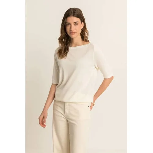Fris en licht, deze gebreide trui voor dames in ecru van Expresso is een praktische basic voor het voorjaar. De korte lengte en de boothals geven een moderne, open uitstraling, terwijl de lange rechte mouwen zorgen voor een rustige lijn. De effen ecru kleur laat zich makkelijk combineren met je garderobe en zorgt voor een zachte, verfijnde uitstraling.Stijlvolle details in een zachte kwaliteit Gemaakt van 63% viscose en 37% polyamide voor een soepele, zachte touch Korte lengte, mooi bij een hoge taille broek of rok Boothals die subtiel de halslijn accentueert Lange, rechte mouwen voor een tijdloos silhouet Effen kleur in ecru, gemakkelijk te combineren Gebreide structuur voor een rustige, verzorgde uitstraling Zonder sluiting, je trekt de trui eenvoudig over het hoofdIdeaal voor het lente seizoenDeze trui uit de Boutique collectie is gemaakt voor het lente seizoen. De stof voelt licht en soepel aan, waardoor je hem prettig draagt op mildere dagen. Combineer de trui met een jeans voor een casual dag of met een nette pantalon naar je werk.Expresso, aandacht voor pasvorm en stijlExpresso staat bekend om items met aandacht voor vorm en detail. De collecties zijn ontworpen om goed aan te sluiten op het lichaam en toch comfortabel te blijven. Met deze trui kies je voor een tijdloos garderobestuk dat makkelijk in je dagelijkse outfits past.Een zachte trui die je vaak uit de kast zult pakken.
