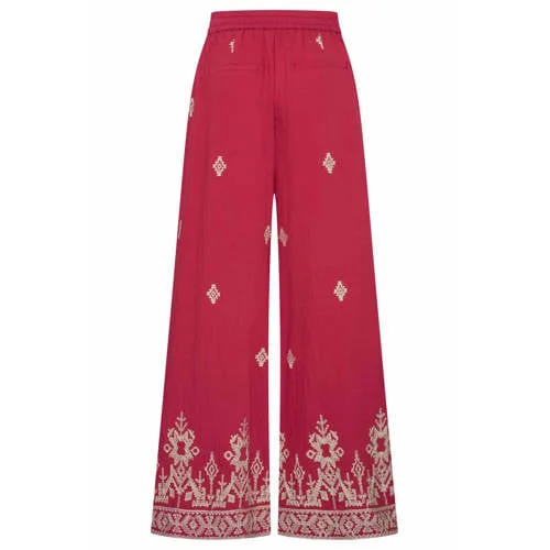 Val op met deze rode wide leg damesbroek van Expresso in een speelse rood/ecru print. De lange broek heeft een comfortabele high waist met elastische tailleband en koord, waardoor die mooi aansluit in de taille en soepel langs de benen valt. Ideaal voor warme dagen, want de stof met 85% katoen voelt aangenaam en luchtig aan. De all over print en subtiele borduursels geven de broek een verzorgde, zomerse uitstraling.Zomerse wide leg met fijne details Wide leg pasvorm voor een luchtige, elegante look High waist met elastische tailleband en koord voor extra comfort All over rood/ecru print met borduursels voor een verfijnd effect Zakken voor, handig voor kleine essentials Gemaakt van 85% katoen voor een zachte, soepele touch Lange lengte, geschikt voor zowel platte schoenen als hakken Onderdeel van de Boutique collectie, perfect voor de zomerMakkelijk te stylen voor elke zomerdagDeze broek draag je net zo makkelijk casual als wat gekleder. Combineer met een eenvoudig T-shirt of top in ecru voor een rustige basis, of kies een rood bovenstuk om de print te laten terugkomen. Sneakers eronder voor een relaxte dag, of sandalen voor een meer geklede uitstraling.Expresso: sterke pasvormen en doordachte ontwerpenExpresso staat bekend om mode die moderne vrouwen ondersteunt in hun drukke leven. De ontwerpen zijn doordacht, met aandacht voor pasvorm, mooie stoffen en fijne details. Zo krijg je kleding die prettig zit, er verzorgd uitziet en die je met vertrouwen uit de kast pakt.Een comfortabele en opvallende broek die je zomergarderobe direct compleet maakt.