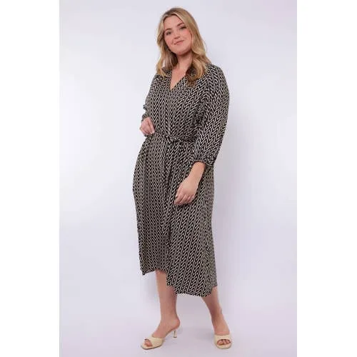 Deze Exxcellent midi jurk met grafische print geeft je garderobe een moderne update. De zwarte ondergrond met beige print zorgt voor een rustig patroon dat toch direct opvalt. De jurk valt ruim over de knie richting kuit, heeft een vloeiende A-lijn en is gemaakt van 100% viscose, een luchtige stof die soepel meebeweegt.Comfortabele pasvorm in grote maten A-lijn model dat losjes rond heupen en benen valt Geschikt voor grote maten, met aandacht voor extra bewegingsruimte Driekwart ballonmouwen met ruime fit bij de bovenarm V-hals die het decolleté subtiel accentueert Ceintuur in de taille voor een verstelbare pasvorm Geen sluiting, zodat je de jurk eenvoudig over het hoofd aantrekt Gemaakt van 100% viscose met een zachte, soepele touch Grafische print in zwart en beige voor een rustige, moderne look Geschikt voor handwas volgens het waslabelGeschikt voor verschillende momentenDeze jurk is geschikt voor het tussenseizoen. De lengte tot op de kuit en de driekwartmouwen maken het model passend voor zowel een werkdag als een diner of familiedag. De ceintuur is verstelbaar, zodat je de taillewijdte naar wens aanpast.Exxcellent met aandacht voor pasvormExxcellent ontwerpt kleding speciaal voor vrouwen met een maat meer, met aandacht voor pasvorm en draaggemak. De modellen worden zo gesneden dat ze mooi rond het lichaam vallen en voldoende ruimte bieden op de juiste plaatsen. Het merk combineert actuele trends met een doordachte snit, waardoor de kleding prettig draagt in het dagelijks gebruik.Een doordachte jurk voor dagen waarop je makkelijk en toch verzorgd gekleed wilt gaan.