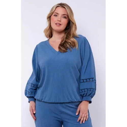 Deze blauwe Exxcellent dames top is een fijne basis voor dagen waarop je er verzorgd uit wilt zien zonder veel moeite te doen. De soepele, licht glanzende stof valt elegant rond het lichaam en sluit mooi aan bij de vrouwelijke pasvorm van de grote maten collectie. De subtiele V-hals en de speelse ballonmouwen geven de top een stijlvolle uitstraling die past bij zowel kantoor als een etentje.Verfijnde details voor elke dag Effen blauwe kleur, goed te combineren met jeans, nette broek of rok Blousetop model dat luchtig om het lichaam valt Lange ballonmouwen voor een vrouwelijke en moderne look V-hals die het decolleté rustig accentueert Elastische boord en smockwerk voor een mooie aansluiting bij de heupen Broderie details zorgen voor een verfijnde afwerking Gemaakt van een soepele, zachte stof met lichte stretch voor extra draagcomfort Geen sluiting, je trekt de top eenvoudig over het hoofd aanVeelzijdige top voor het voorjaarDeze top uit de feminine collectie is ideaal voor het lenteseizoen. Combineer met een donkere broek voor een geklede outfit of draag de top met een lichte jeans voor een meer casual uitstraling. De lange mouwen maken het een fijne keuze voor wisselvallige dagen.Exxcellent: modieuze pasvormen in grote matenExxcellent richt zich op modieuze kleding in grote maten met aandacht voor pasvorm en comfort. De ontwerpen zijn gemaakt om mooi om het lichaam te vallen en vrouwelijke vormen te volgen, zonder in te leveren op stijl. Zo voelt elke outfit verzorgd en doordacht.Een stijlvolle keuze waarmee je eenvoudig een geklede en toch ontspannen look creëert.