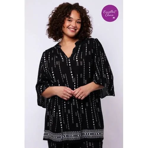 De Exxcellent Faye top is een luchtige blousetop die je garderobe klaar maakt voor het voorjaar. De zwart/offwhite all over print zorgt voor een rustig dessin, terwijl de soepel vallende stof prettig meebeweegt. Deze top is onderdeel van het grote maten assortiment en combineert een vrouwelijke pasvorm met handige details voor elke dag.Luchtige blousetop met fijne details Blousetop met V-hals voor een open halslijn Half lange, wijde mouwen voor extra bewegingsvrijheid en een ruimvallend silhouet Zwart/offwhite all over print die gemakkelijk te combineren is Gemaakt van 100% viscose, een soepele stof met een zachte touch Geen sluiting, waardoor je de top eenvoudig aantrekt Borduursels als subtiel detail op de stof Onderdeel van de Feminine collectie en speciaal ontworpen voor grote matenGestylde look in een handomdraaiDeze Faye top past goed bij een zwarte broek of een lichte jeans voor een dagelijkse look. De luchtige stof en wijde mouwen maken de top ideaal voor lentedagen. Door de V-hals is er ruimte voor een subtiele ketting.Exxcellent: mode met aandacht voor pasvormExxcellent richt zich op dames die waarde hechten aan een goede pasvorm in grote maten. De collecties worden ontworpen met oog voor detail, fijne materialen en vrouwelijke lijnen, zodat je je prettig voelt in wat je draagt.Een veelzijdige blousetop die je gemakkelijk styled voor zowel werk als vrije tijd.