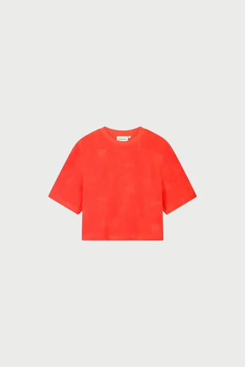 Dit T-Shirt van Fabienne Chapot voor dames heeft een boxy, cropped pasvorm met korte mouwen, een comfortabele ronde hals en een rechte zoom. De soepele kwaliteit voelt zacht aan en toont een subtiel ton-sur-ton reliëf dessin over het hele T-Shirt. Het ontwerp is effen, zonder sluiting en zonder zakken voor een clean silhouet. Geen zichtbare logoletters aan de voorkant; volledig gefocust op kleur en textuur.