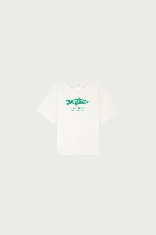 Je herkent dit kledingstuk aan de zachte jersey-kwaliteit, rechte fit en normale lengte. De ronde hals en korte mouwen zorgen voor draaggemak; zonder sluiting en zonder zakken. Op de voorzijde staat een groene vis-illustratie met de woorden LA PETITE SARDINE en SEAFOOD & CHAMPAGNE BAR; de achterzijde is effen. Kleur: wit. Modelnaam: Fabienne Chapot T-Shirt CLTTSH17SS260218. Categorie: Dames, T-Shirts & Tops.