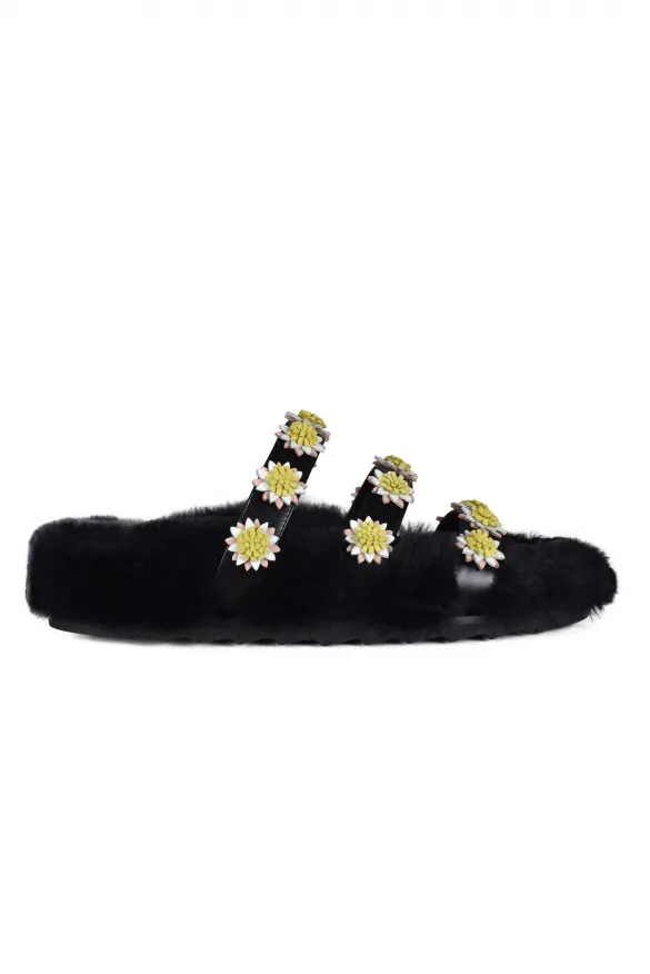 Zwarte Berkley-sandalen Fabrizio Viti.Drie dunne leren bandjes met madeliefjes.Voorgevormde binnenzool gevoerd met schapenvachtRubberen buitenzoolGemaakt in Italië.