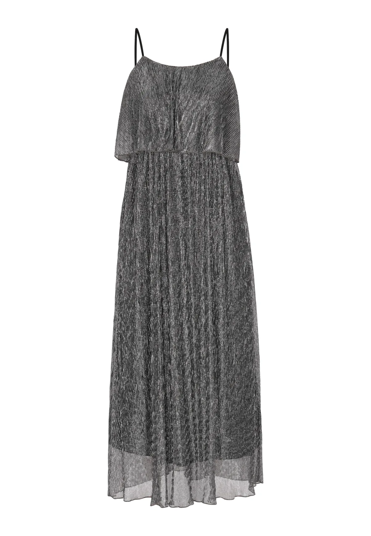 Geef je garderobe een boost met deze mouwloze jurk. Dunne schouderbandjes creëren een gelaagd ontwerp, geaccentueerd door een overlay met ruches bij de buste voor een vleugje charme met ruches. Een verzamelde tailleband loopt over in een losvallende rok en creëert een elegant silhouet dat op knielengte of eventueel midi-lengte valt. De lichtgewicht, semi-transparante stof heeft een structuurpatroon dat subtiel glinstert. Jurk