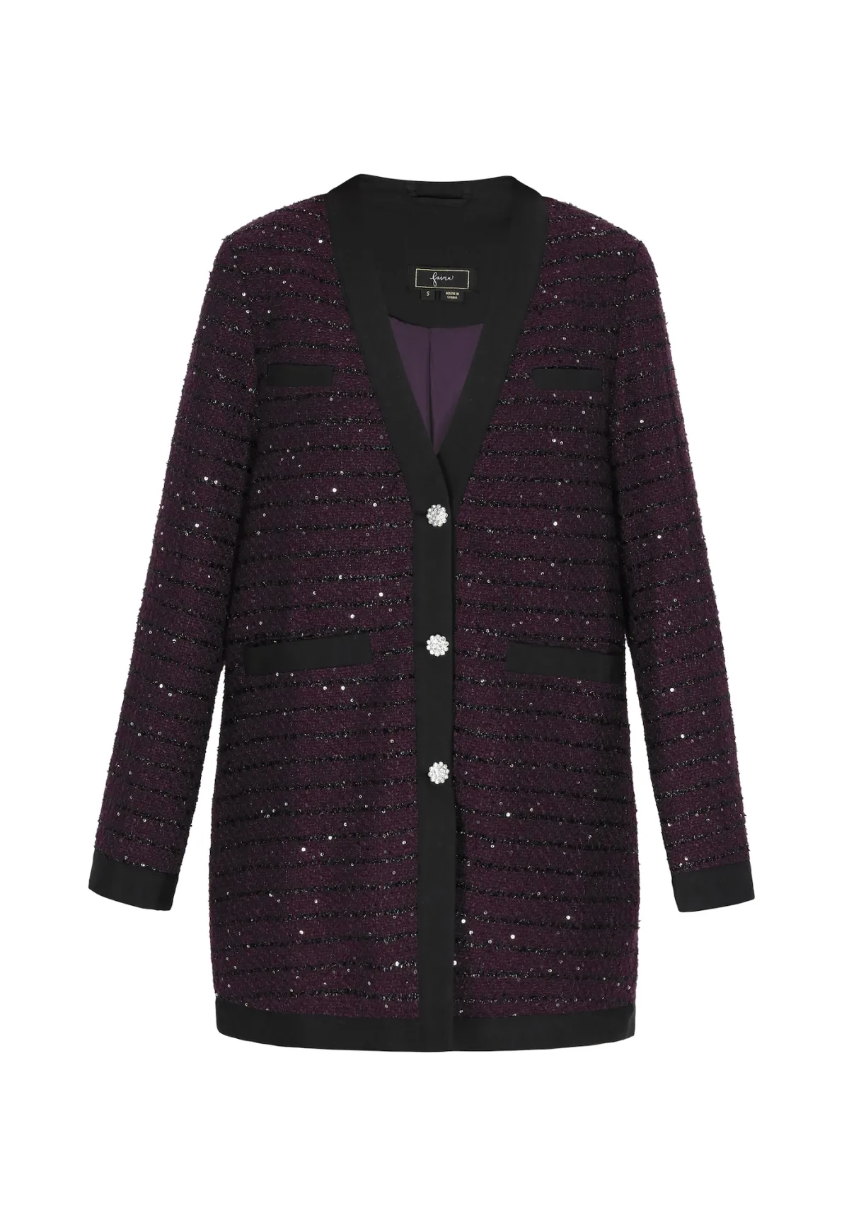 Design: Opgezette zakken; Type sluiting: Knoopsluiting; Voering: Licht gevoerd; Motief: Effen; Kraag: Zonder kraag; Details: Pailletten, Sierstenen; Extra’s: Glitterend; Pasvorm: Normale pasvorm; Armlengte: Lange mouw; Lengte: Lange pasvorm