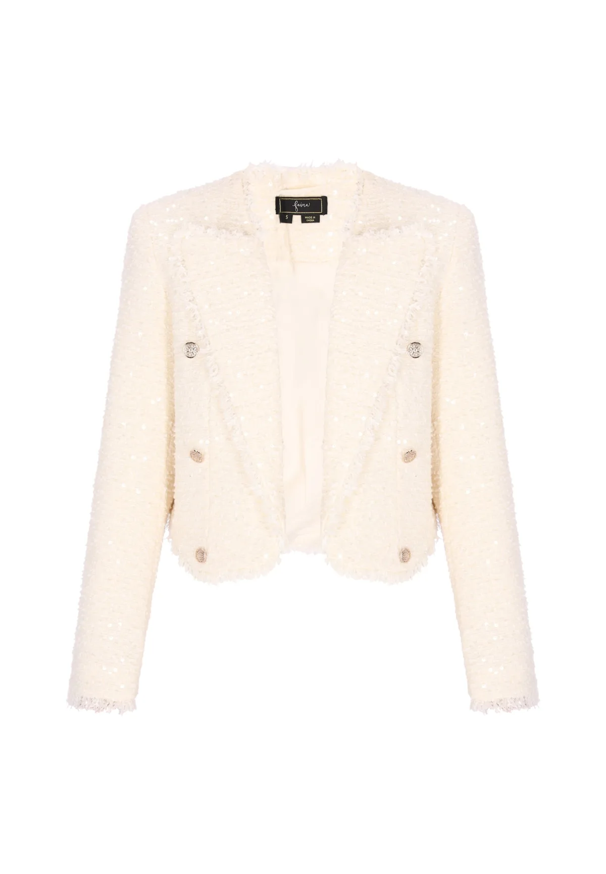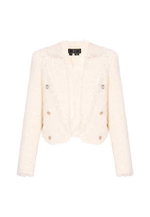 Design: Revers kraag; Type sluiting: Knoopsluiting; Voering: Licht gevoerd; Materiaal: Bouclé; Motief: Mélange; Details: Pailletten; Extra's: Label patch/label flag, Bouclé; Pasvorm: Normale pasvorm; Armlengte: Lange mouw; Lengte: Korte pasvorm