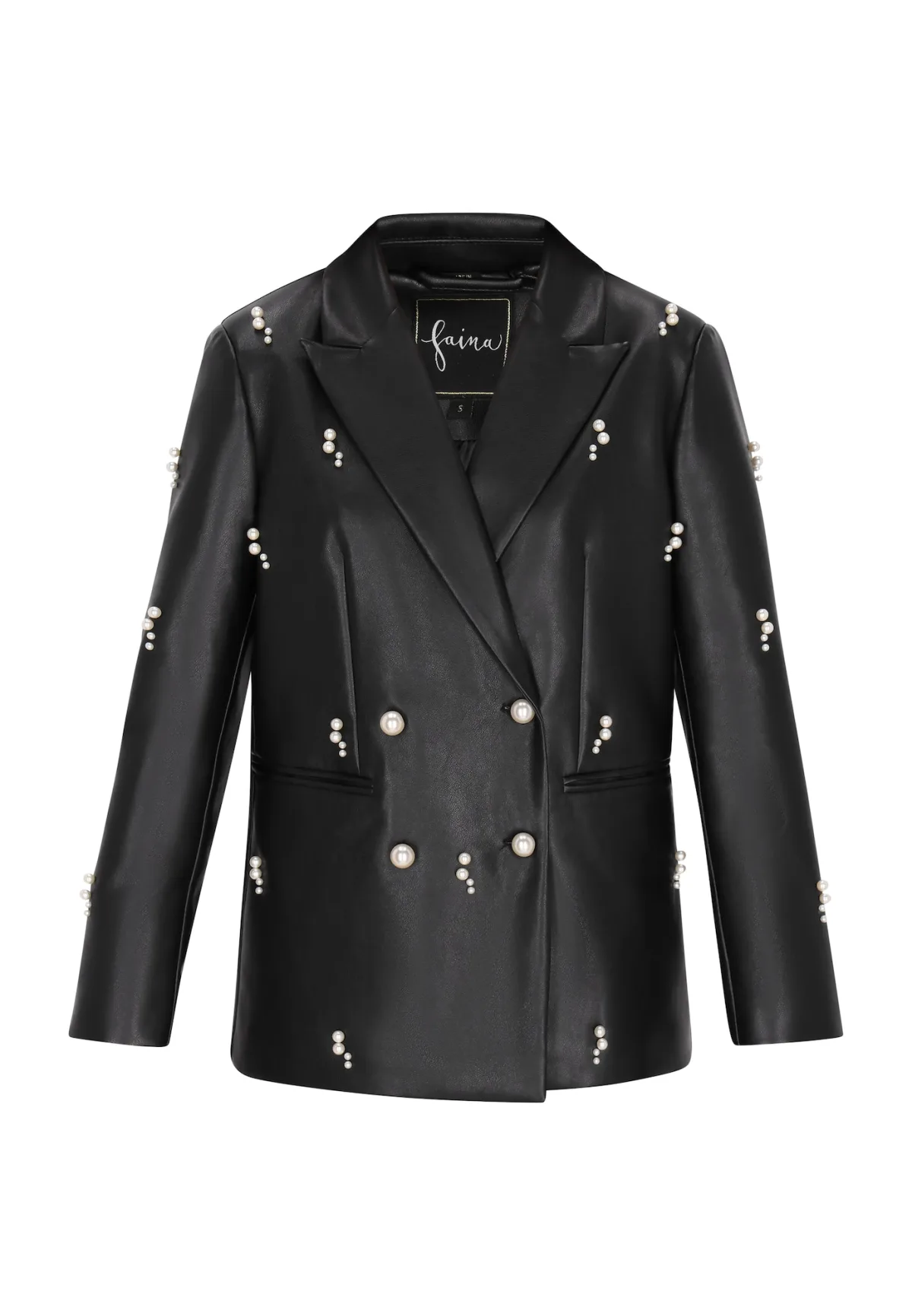 Design: Revers kraag; Type sluiting: Knoopsluiting; Voering: Licht gevoerd; Materiaal: Imitatieleder; Motief: Effen; Details: Parels; Extra’s: Met halfedelstenen, Op staal naden; Pasvorm: Normale pasvorm; Armlengte: Lange mouw; Lengte: Normale lengte