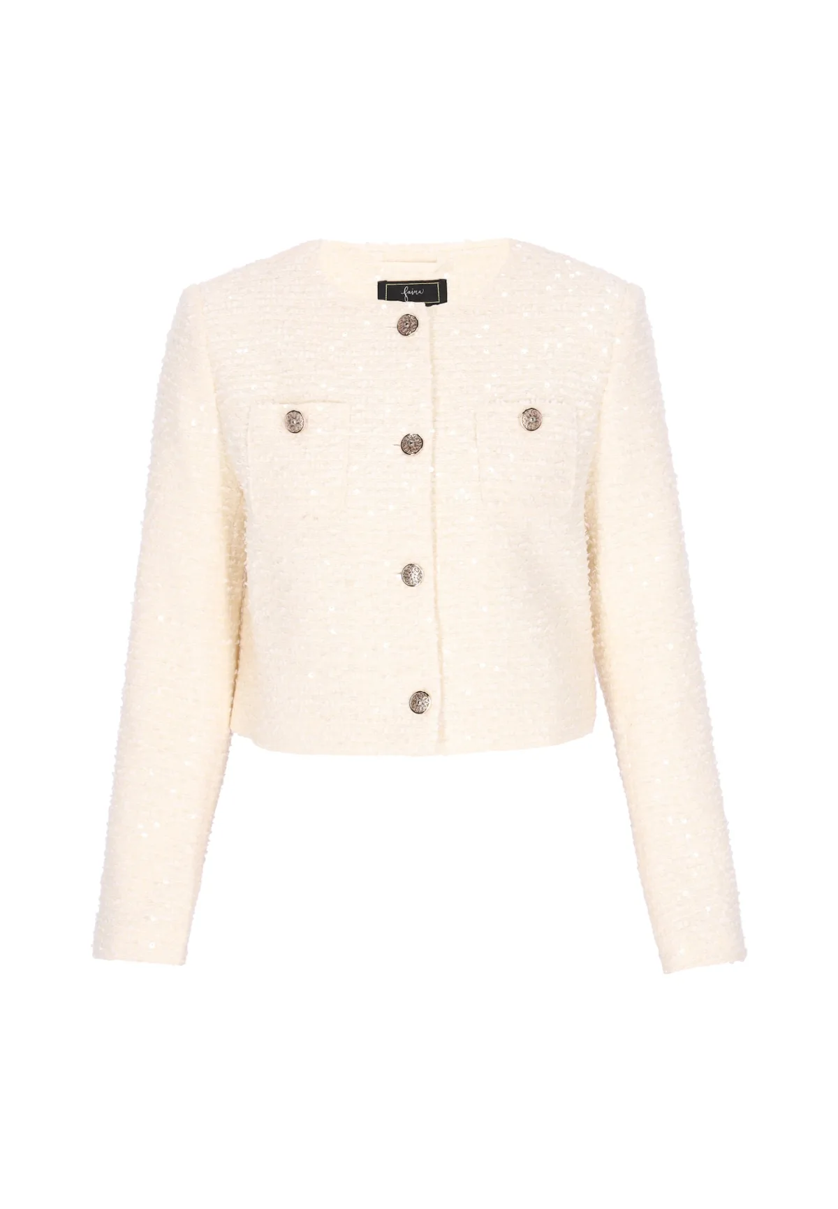 Design: Rechte zoom, Knop placket, Opgezette zakken; Type sluiting: Knoopsluiting; Voering: Licht gevoerd; Materiaal: Bouclé; Motief: Mélange; Kraag: Zonder kraag; Extra's: Glanzend, Op staal naden, Met textuur; Pasvorm: Normale pasvorm; Armlengte: Lange mouw; Lengte: Korte pasvorm