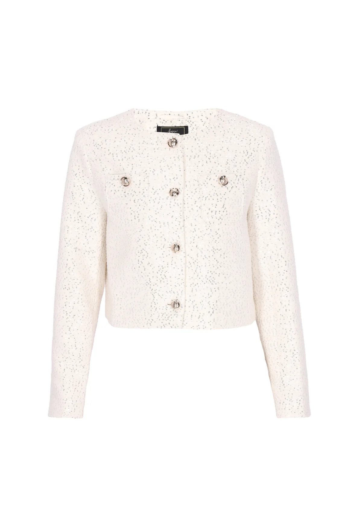 Design: Rechte zoom, Knop placket, Opgezette zakken; Type sluiting: Knoopsluiting; Voering: Licht gevoerd; Materiaal: Bouclé; Kraag: Zonder kraag; Extra's: Glitterend, Op staal naden, Met textuur; Pasvorm: Normale pasvorm; Armlengte: Lange mouw; Lengte: Normale lengte