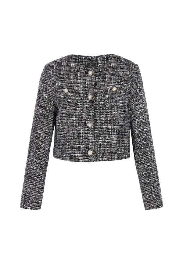 Design: Rechte zoom, Knop placket, Borstzak; Type sluiting: Knoopsluiting; Voering: Licht gevoerd; Materiaal: Bouclé; Motief: Mélange; Kraag: Zonder kraag; Extra's: Met textuur, Voelt zacht aan; Pasvorm: Normale pasvorm; Armlengte: Lange mouw; Lengte: Korte pasvorm