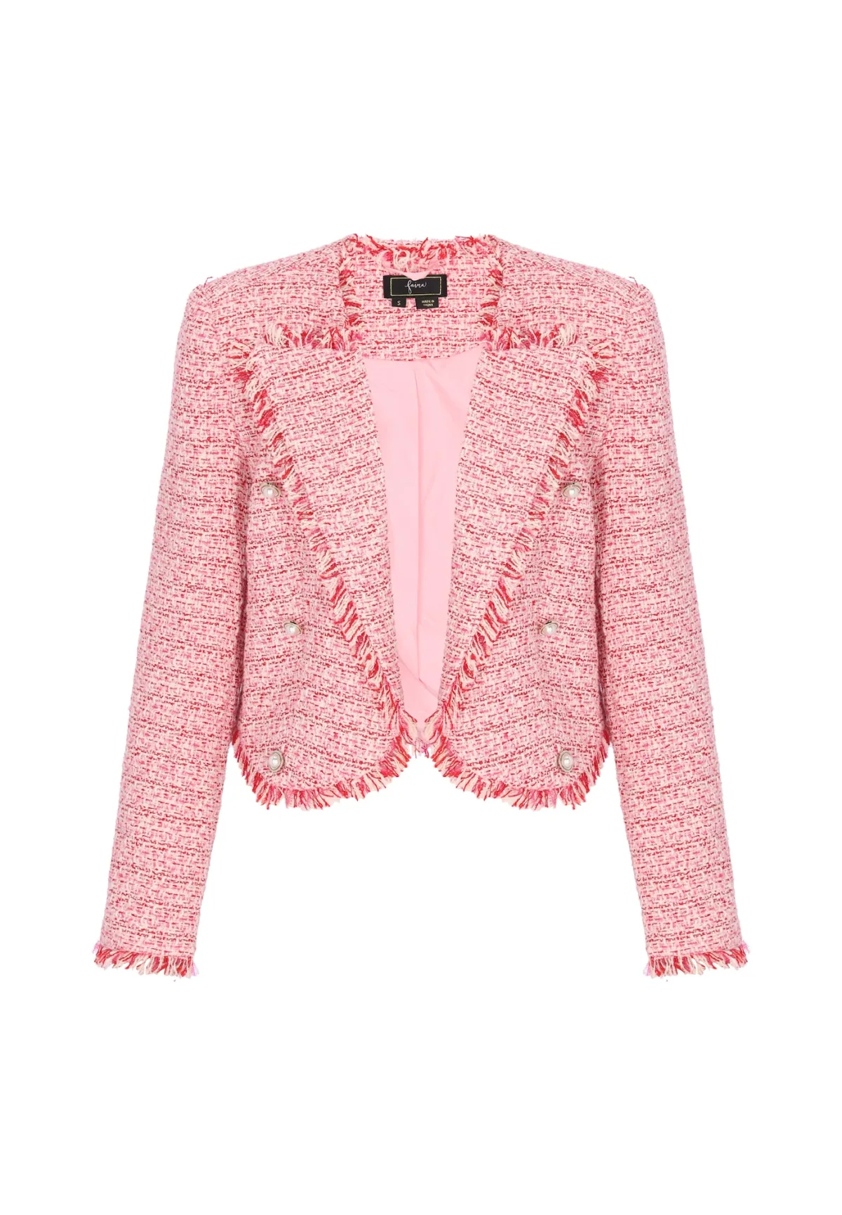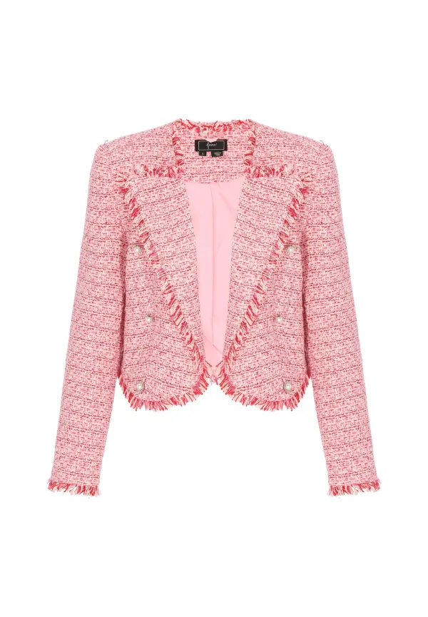 Design: Revers kraag; Type sluiting: Knoopsluiting; Voering: Licht gevoerd; Materiaal: Bouclé; Details: Ruches; Extra's: Applicaties; Pasvorm: Normale pasvorm; Armlengte: Lange mouw; Lengte: Normale lengte