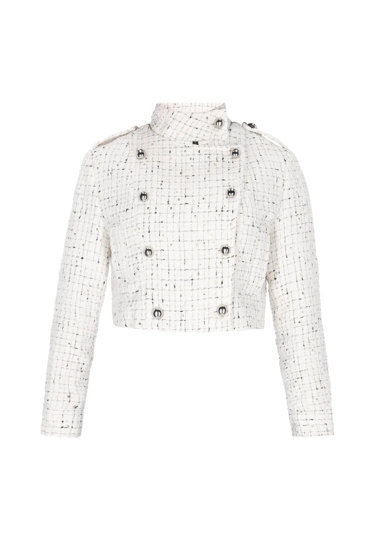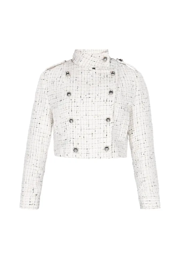 Design: Rechte zoom, Knop placket, Staande kraag, Paspelzak, Knop sluiting; Type sluiting: Knoopsluiting; Voering: Licht gevoerd; Materiaal: Bouclé; Motief: Geruit; Kraag: Opstaande kraag; Details: Pailletten, Gedrapeerd; Extra's: Pailletten, All-over patroon, Met textuur; Pasvorm: Normale pasvorm; Armlengte: Lange mouw; Lengte: Korte pasvorm