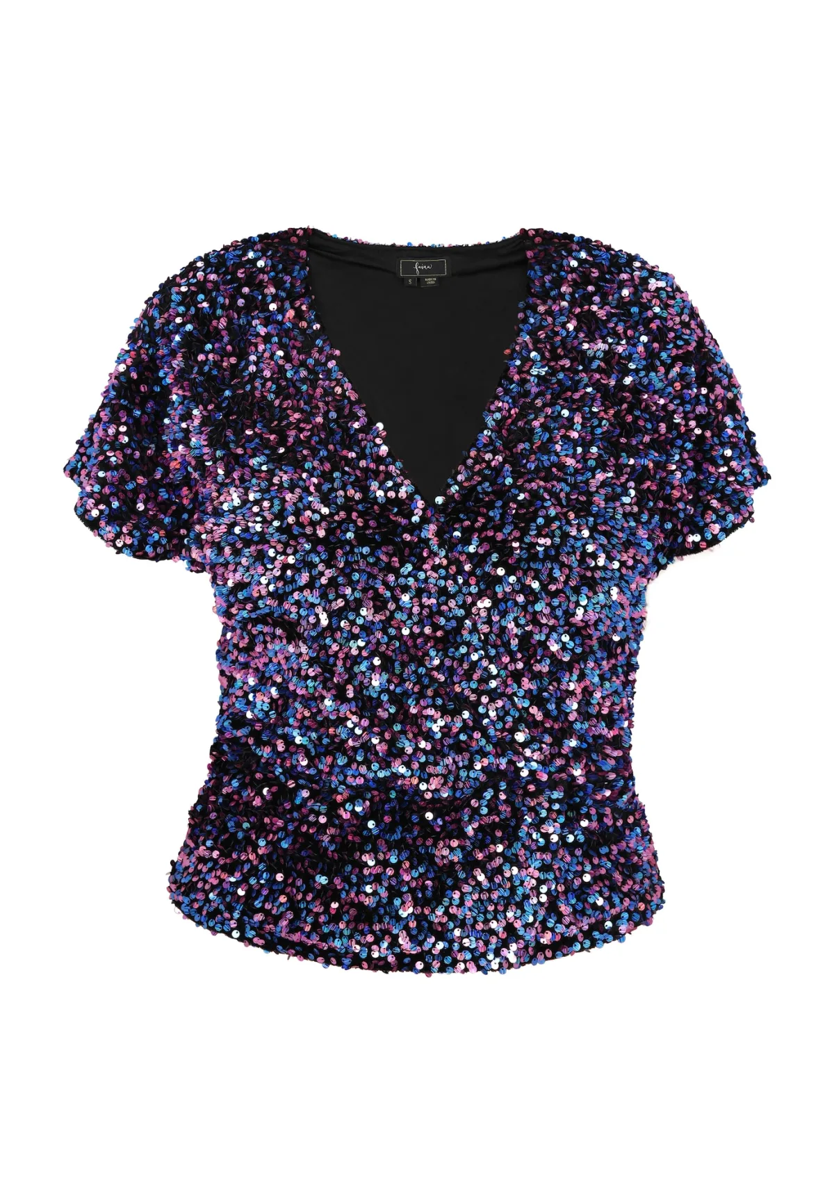 Voeg glamoureuze sprankeling toe aan je look met deze top met V-hals en een glinsterende, glitterende afwerking. De losvallende mouwen en het gedrapeerde silhouet zorgen voor een relaxte maar toch chique look. Perfect om een vleugje elegantie toe te voegen aan uw garderobe voor speciale gelegenheden. Blouse