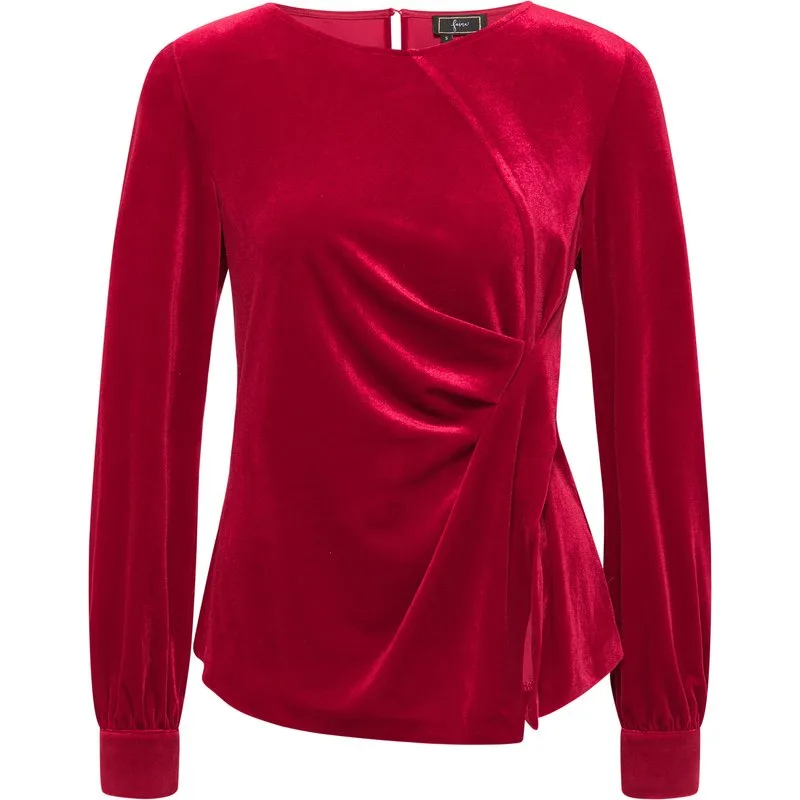 De fluweelachtige glans geeft deze blouse van faina zijn bijzondere uitstraling. Gesneden in een wikkellook, voegt een fijne split in de zoom flirterige spanning toe aan uw look. Een kleine halsuitsnijding in de nek die met een knoopje wordt gesloten, zorgt voor extra, bijzondere aantrekkingskracht. De spannende iriserende look eindigt met een klassieke blousemouw, plus manchet, waardoor het de ideale aanvulling is op uw slank gesneden broeken zoals rokken.