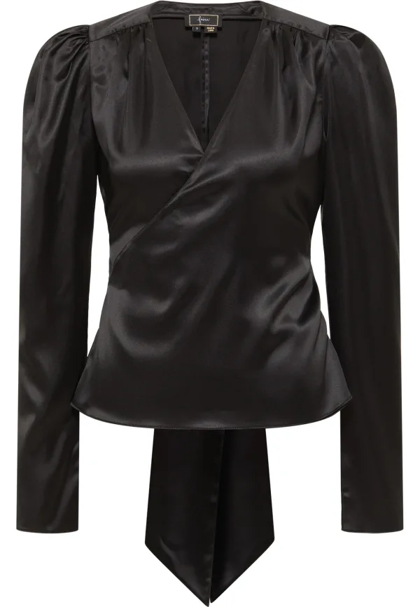 Vrouwelijke elegantie en een zijdeachtige look inspireren ons met deze blouse van faina. Gesneden in een wikkellook en van glinsterend, aaibaar satijn met een brede strikband, maakt hij indruk met zijn speelse en verleidelijke uitstraling. De licht geribbelde en versterkte schouderpartij vormt een bewust delicaat contrast dat uw zelfverzekerde, volle vrouwelijkheid nog eens onderstreept. Combineer het met slanke broeken en nauwsluitende rokken om het geheel perfect in scène te zetten.