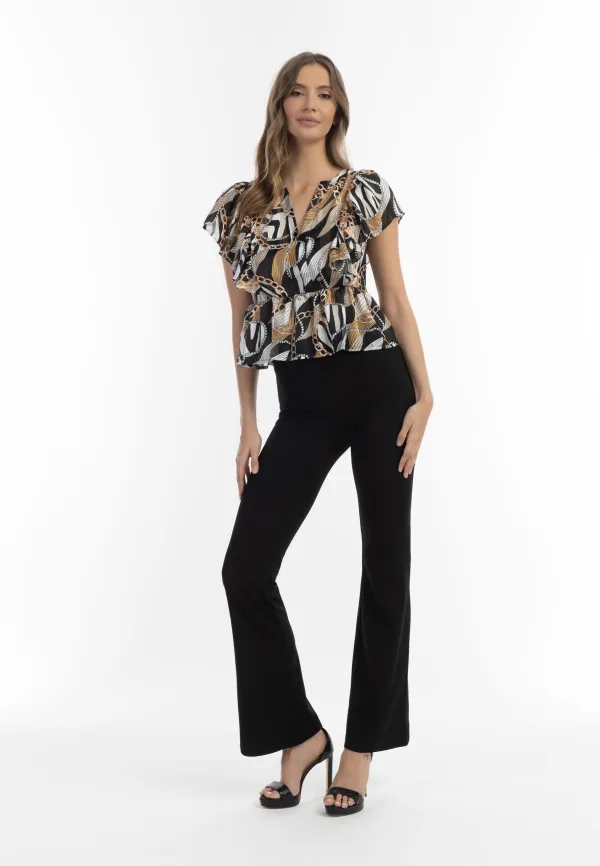 Dit lichte, semi-transparante blouseontwerp van faina is uitgevoerd met een ruche en peplum. De bijzondere print van parels en kettingen completeert de luxueuze uitstraling van dit model, dat net zo goed past bij een slanke broek of strakke kokerrok. Een vrouwelijke V-hals en een ritssluiting opzij maken het model compleet.